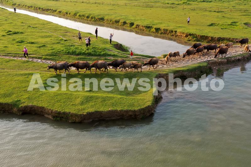 图片说明:2023年5月18日,在四川省南充市蓬安县相如镇油房沟村嘉陵江段,游客观看牛群暮归(无人机照片)。