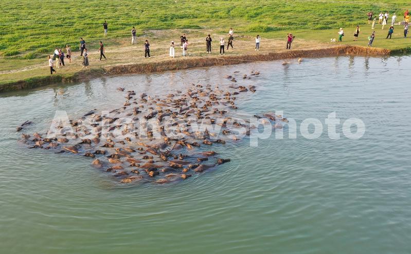 图片说明:2023年5月18日,在四川省南充市蓬安县相如镇油房沟村嘉陵江段,游客观看牛群渡江归栏(无人机照片)。