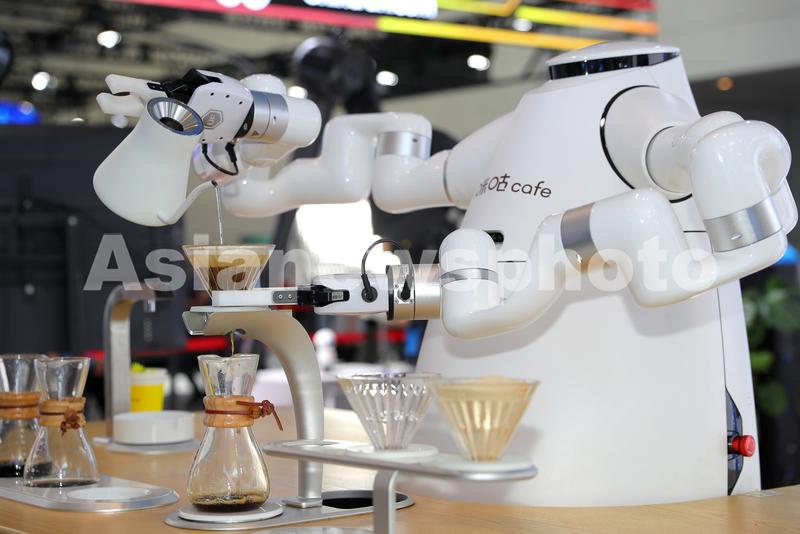 第七届世界智能大会智能科技展上,中国移动咪咕智能机器人表演冲咖啡。