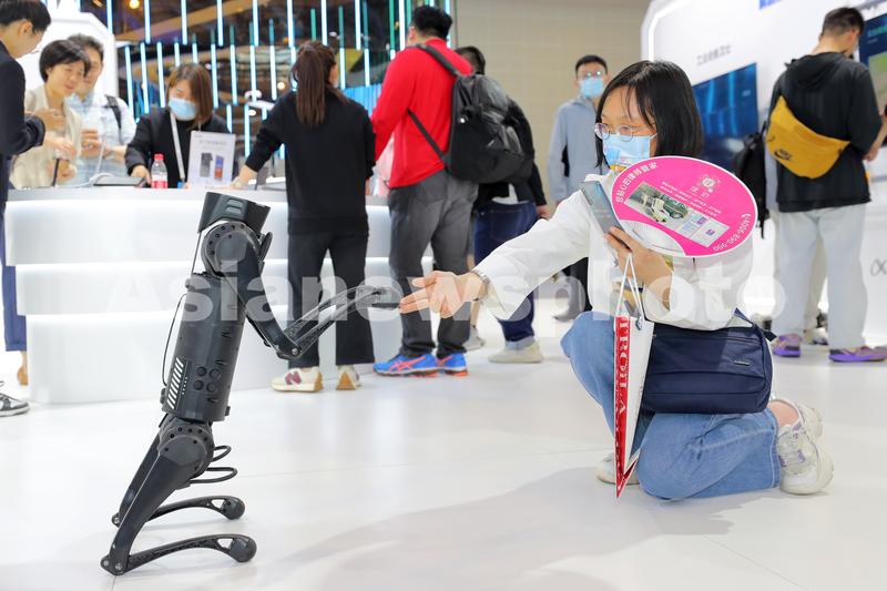 第七届世界智能大会智能科技展上,观众与科大讯飞的一款机器狗互动。