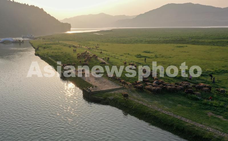 图片说明:2023年5月18日,在四川省南充市蓬安县相如镇油房沟村嘉陵江段,游客观看牛群暮归(无人机照片)。