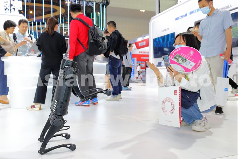 第七届世界智能大会智能科技展上,观众与科大讯飞的一款机器狗互动。