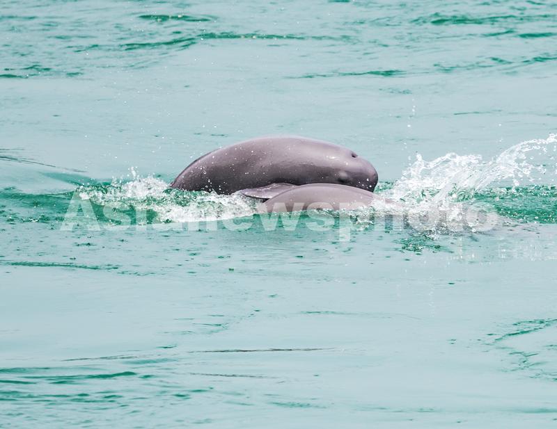 2023年5月20日,江豚在湖北省宜昌市葛洲坝下游水域逐浪嬉戏。