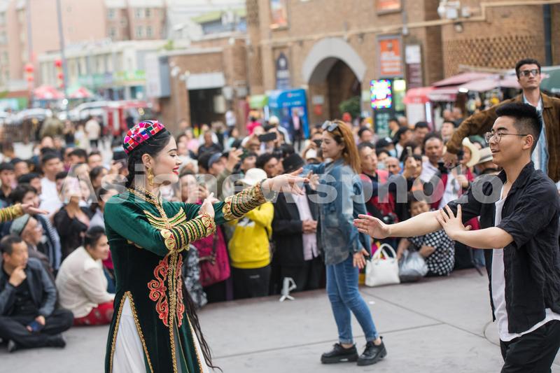 图片说明:2023年5月21日,新疆国际大巴扎景区,游客跳起了欢快的舞蹈。
