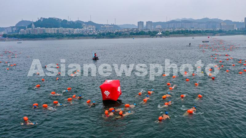 2023年5月21日,浙江省杭州市淳安县千岛湖镇城中湖水域,“迎亚运”2023年千岛湖公开水域游泳公开赛开赛,吸引全国171支游泳队伍的3500余名选手参赛。