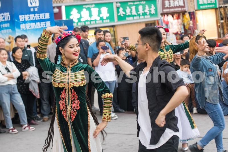 图片说明:2023年5月21日,新疆国际大巴扎景区,游客跳起了欢快的舞蹈。