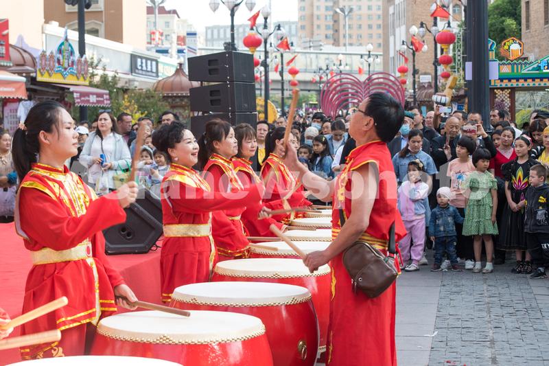图片说明:2023年5月21日,居民在新疆国际大巴扎景区表演锣鼓。