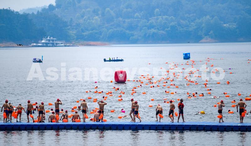 2023年5月21日,浙江省杭州市淳安县千岛湖镇城中湖水域,“迎亚运”2023年千岛湖公开水域游泳公开赛开赛,吸引全国171支游泳队伍的3500余名选手参赛。