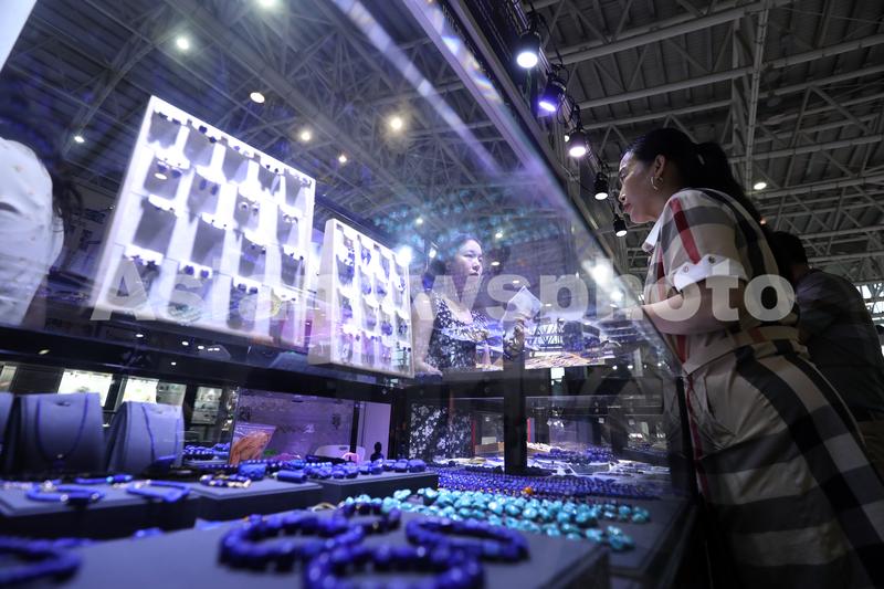 图片说明:5月19日,观众在第十一届中国(湖南)国际矿物宝石博览会上选购商品。