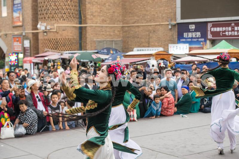 图片说明:2023年5月21日,新疆国际大巴扎景区,游客跳起了欢快的舞蹈。