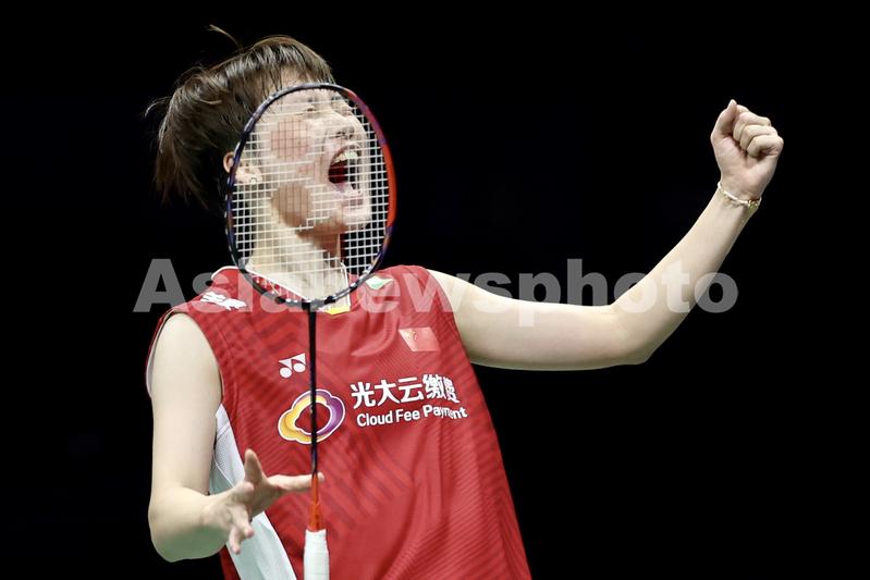中国队女单选手陈雨菲在赛后庆祝胜利。