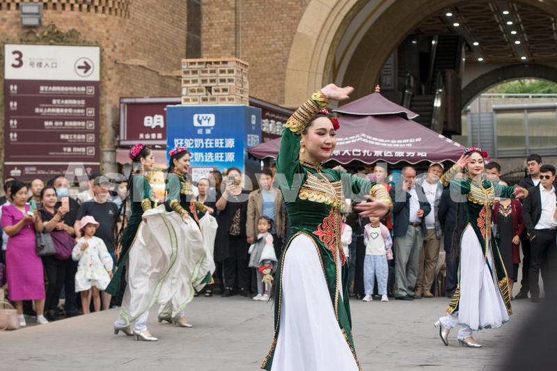图片说明:2023年5月21日,新疆国际大巴扎景区,游客跳起了欢快的舞蹈。