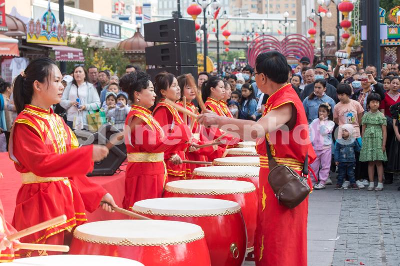 图片说明:2023年5月21日,居民在新疆国际大巴扎景区表演锣鼓。