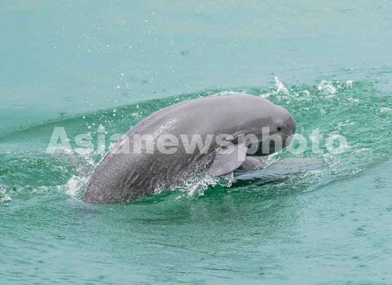 2023年5月20日,江豚在湖北省宜昌市葛洲坝下游水域逐浪嬉戏。