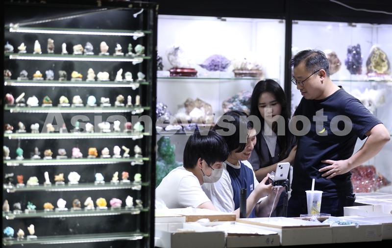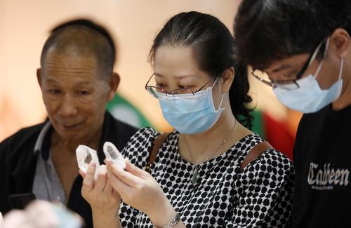 图片说明:5月19日,参展商在第十一届中国(湖南)国际矿物宝石博览会上直播。