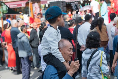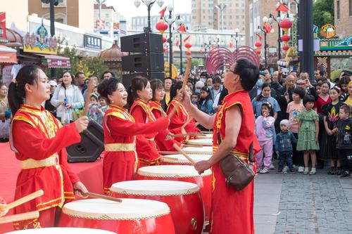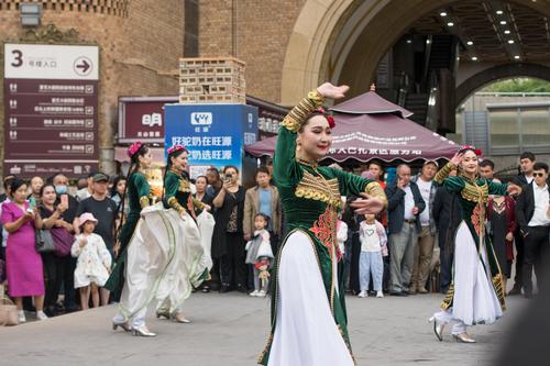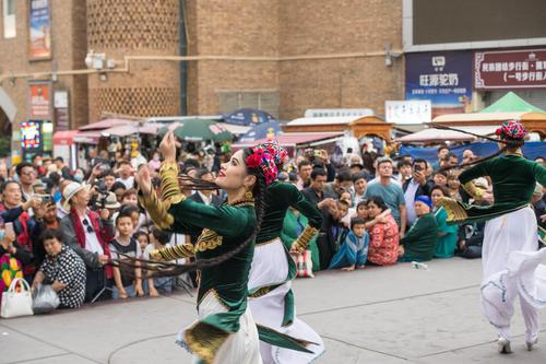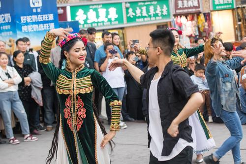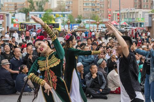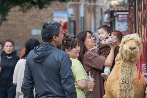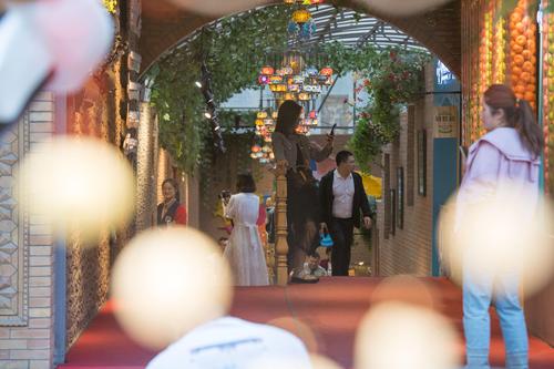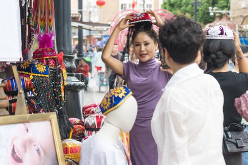 图片说明:2023年5月21日,游客在新疆国际大巴扎景区游玩。
