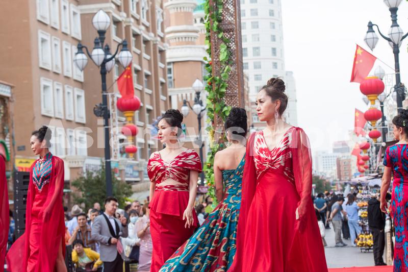 图片说明:2023年5月21日,居民在新疆国际大巴扎景区表演时装秀。