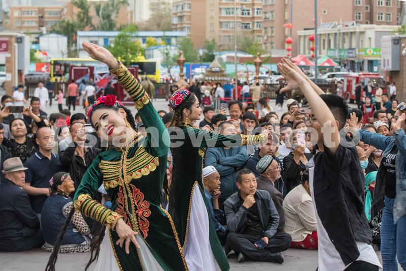 图片说明:2023年5月21日,新疆国际大巴扎景区,游客跳起了欢快的舞蹈。