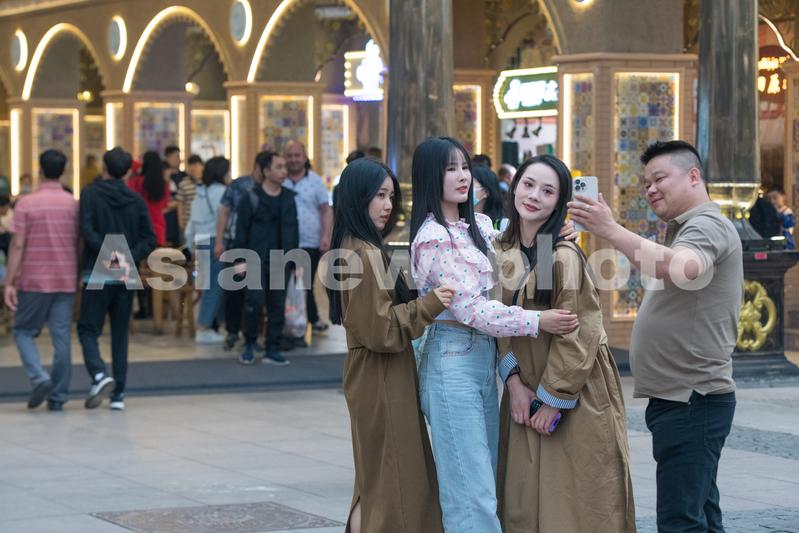 图片说明:2023年5月21日,游客在新疆国际大巴扎景区自拍。