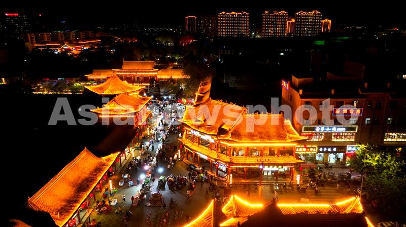 2023年5月22日,夜幕中的甘肃省张掖市甘州区明清老街夜市灯火璀璨,人流涌动,古老典雅的建筑与流光溢彩的灯光交相辉映,构成一幅红火的夜市图景。
