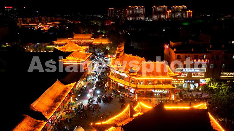 2023年5月22日,夜幕中的甘肃省张掖市甘州区明清老街夜市灯火璀璨,人流涌动,古老典雅的建筑与流光溢彩的灯光交相辉映,构成一幅红火的夜市图景。