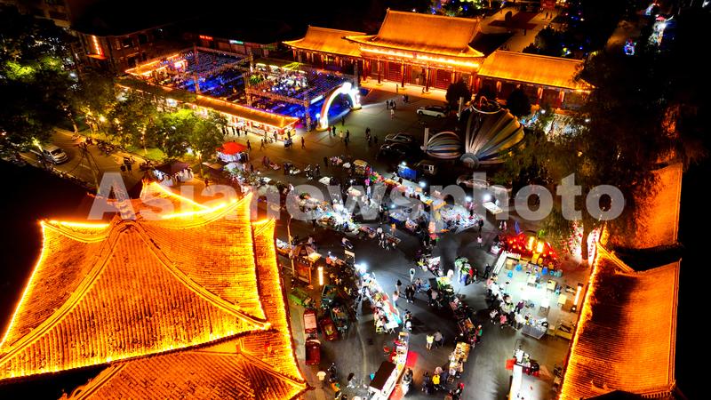 2023年5月22日,夜幕中的甘肃省张掖市甘州区明清老街夜市灯火璀璨,人流涌动,古老典雅的建筑与流光溢彩的灯光交相辉映,构成一幅红火的夜市图景。
