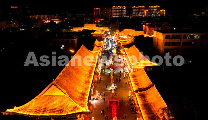 2023年5月22日,夜幕中的甘肃省张掖市甘州区明清老街夜市灯火璀璨,人流涌动,古老典雅的建筑与流光溢彩的灯光交相辉映,构成一幅红火的夜市图景。