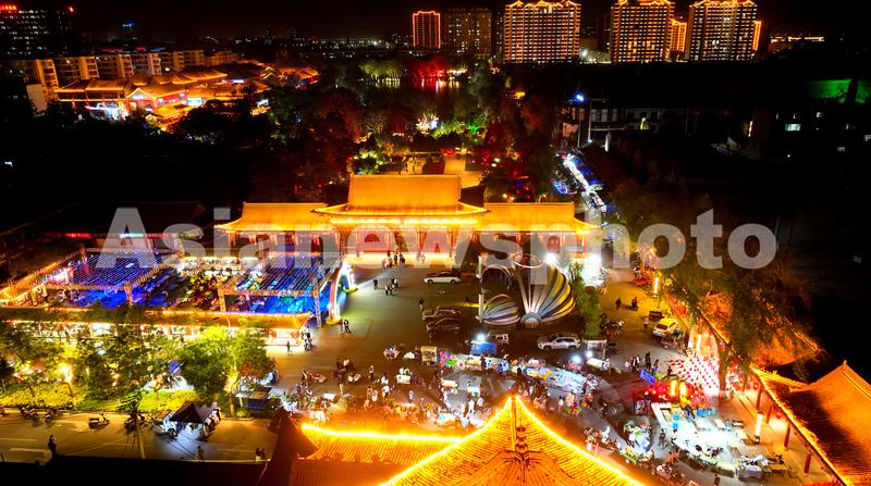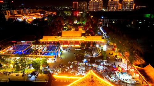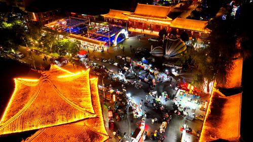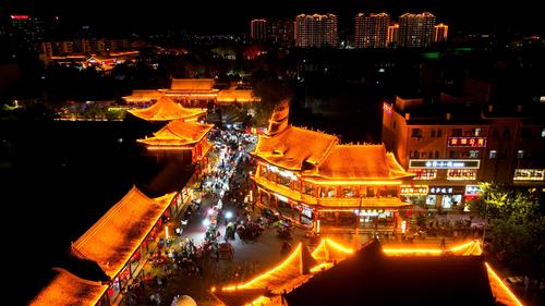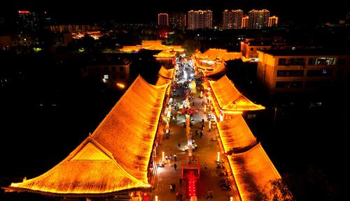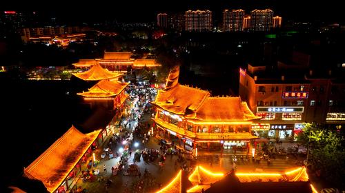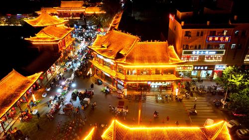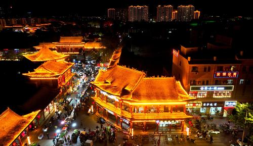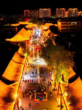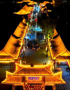 2023年5月22日,夜幕中的甘肃省张掖市甘州区明清老街夜市灯火璀璨,人流涌动,古老典雅的建筑与流光溢彩的灯光交相辉映,构成一幅红火的夜市图景。