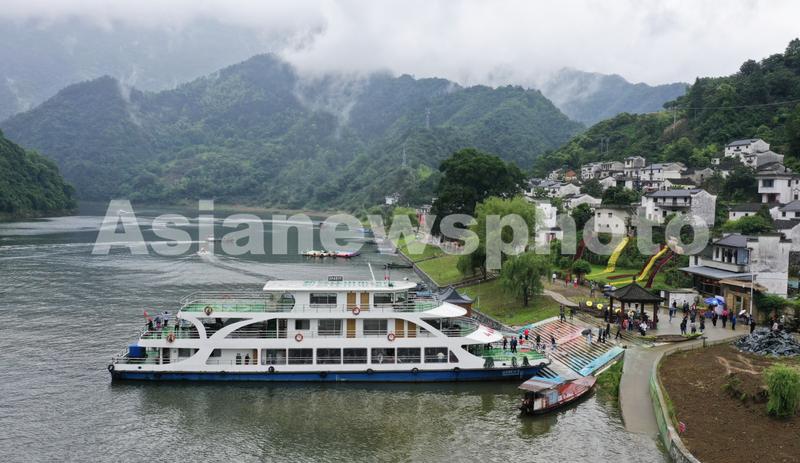 图片说明:2023年5月24日,安徽省黄山市歙县新安江山水画廊风景宜人、烟雨朦胧、环境优美、云雾缭绕,吸引不少游客前来观光旅游。