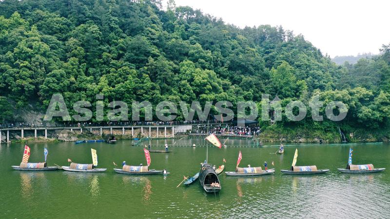 图片说明:2023年5月24日,安徽省黄山市歙县新安江山水画廊烟雨朦胧、风景宜人、环境优美、云雾缭绕,游客在观看九姓捕鱼演出。