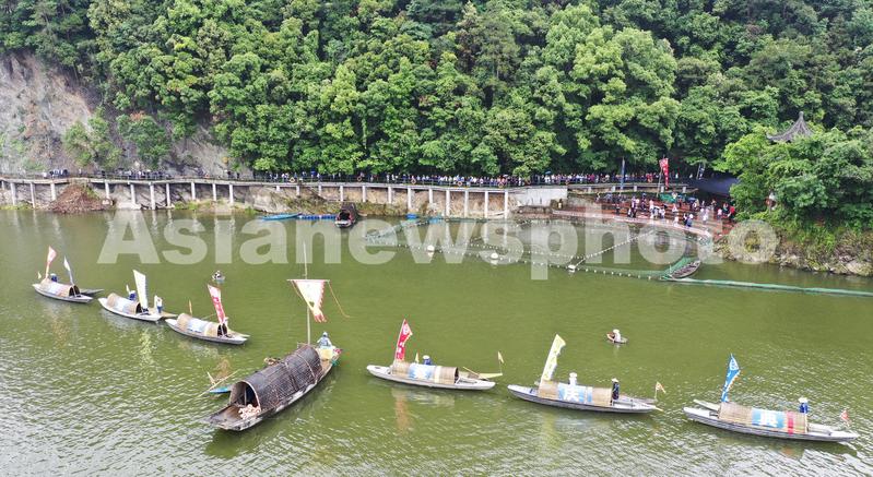 图片说明:2023年5月24日,安徽省黄山市歙县新安江山水画廊烟雨朦胧、风景宜人、环境优美、云雾缭绕,游客在观看九姓捕鱼演出。