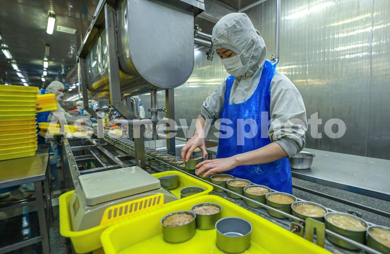 图片说明:2023年5月25日,在山东省荣成市石岛管理区海洋预制菜产业园一家金枪鱼加工企业的车间内,工人们在生产线上忙碌着,赶制出口国外的金枪鱼罐头订单。