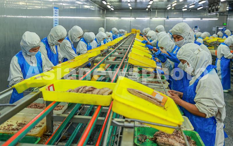 图片说明:2023年5月25日,在山东省荣成市石岛管理区海洋预制菜产业园一家金枪鱼加工企业的车间内,工人们在生产线上忙碌着,赶制出口国外的金枪鱼罐头订单。