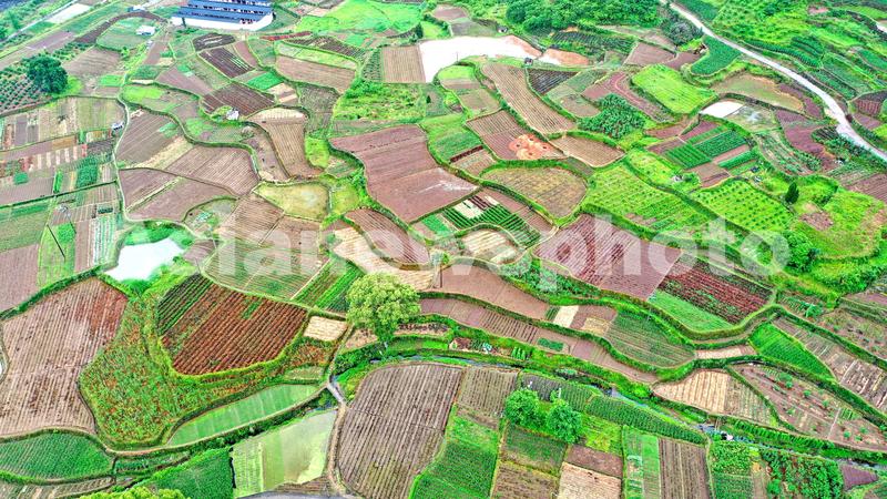 初夏时节,仙居县乡村山岭间,一块块形状各异、五彩斑斓的田地犹如大地上的拼图,呈现别样的田园画卷。