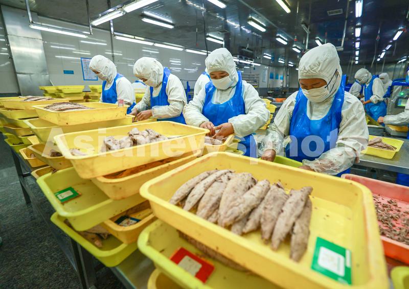 图片说明:2023年5月25日,在山东省荣成市石岛管理区海洋预制菜产业园一家金枪鱼加工企业的车间内,工人们在生产线上忙碌着,赶制出口国外的金枪鱼罐头订单。