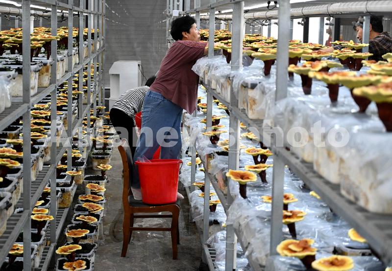 2023年5月26日,当地农民在浙江省金华市武义县寿仙谷有机国药共富工坊智能大棚,对栽培的灵芝进行垫膜,以便收集孢子粉。