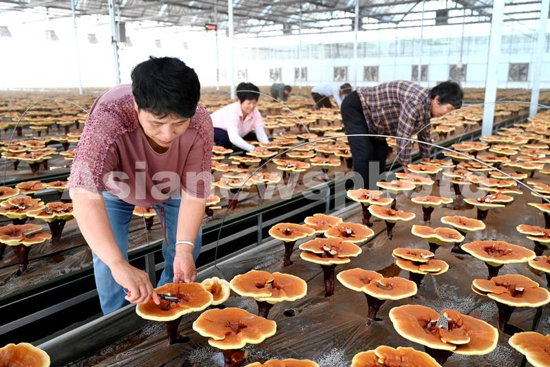 2023年5月26日,当地农民在浙江省金华市武义县寿仙谷有机国药共富工坊智能大棚,对栽培的灵芝进行修剪整形、垫膜,以便收集孢子粉。