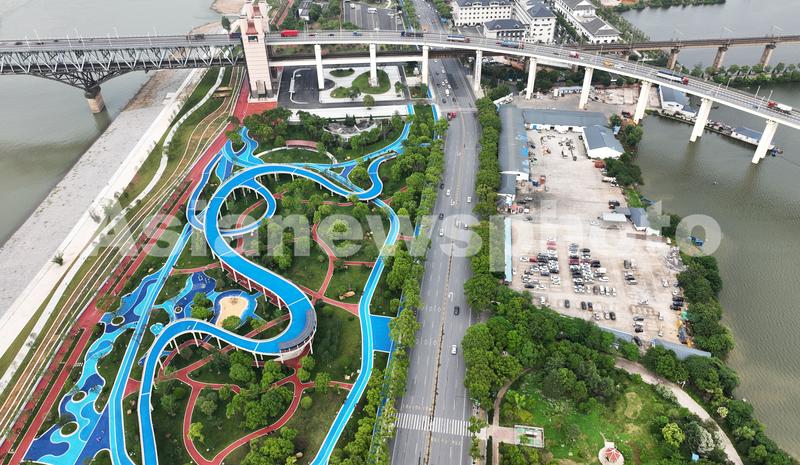 2023年5月25日拍摄的长江国家文化公园九江区段岸线美景。日前,自长江国家文化公园(江西九江段)初步建成开放后,将九江长江公铁两用大桥、琵琶亭、锁江楼、浔阳楼等著名景点连点成片,既能打卡名胜古迹又能散步游玩,每天都吸引了大批游客前来游玩。据悉,该项目以保护传承弘扬长江文化为核心,按照“千年文化、串珠成链,创意重现”的方式,对滨江路沿线共11公里岸线进行升级改造,打造长江最美岸线。