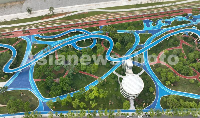 2023年5月25日拍摄的长江国家文化公园九江区段岸线美景。日前,自长江国家文化公园(江西九江段)初步建成开放后,将九江长江公铁两用大桥、琵琶亭、锁江楼、浔阳楼等著名景点连点成片,既能打卡名胜古迹又能散步游玩,每天都吸引了大批游客前来游玩。据悉,该项目以保护传承弘扬长江文化为核心,按照“千年文化、串珠成链,创意重现”的方式,对滨江路沿线共11公里岸线进行升级改造,打造长江最美岸线。