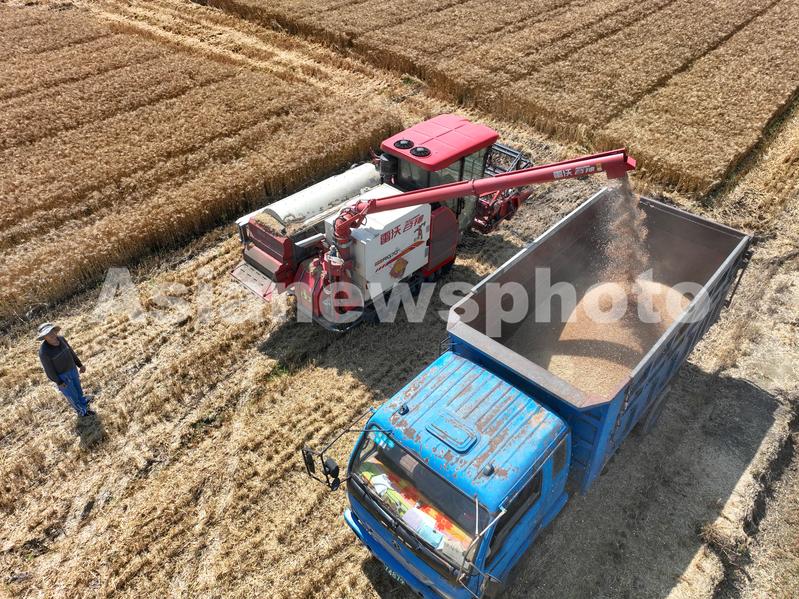 2023年5月28日,收割机在江苏南通江心沙农场二大队的麦田里忙碌卸运刚刚收割的小麦。