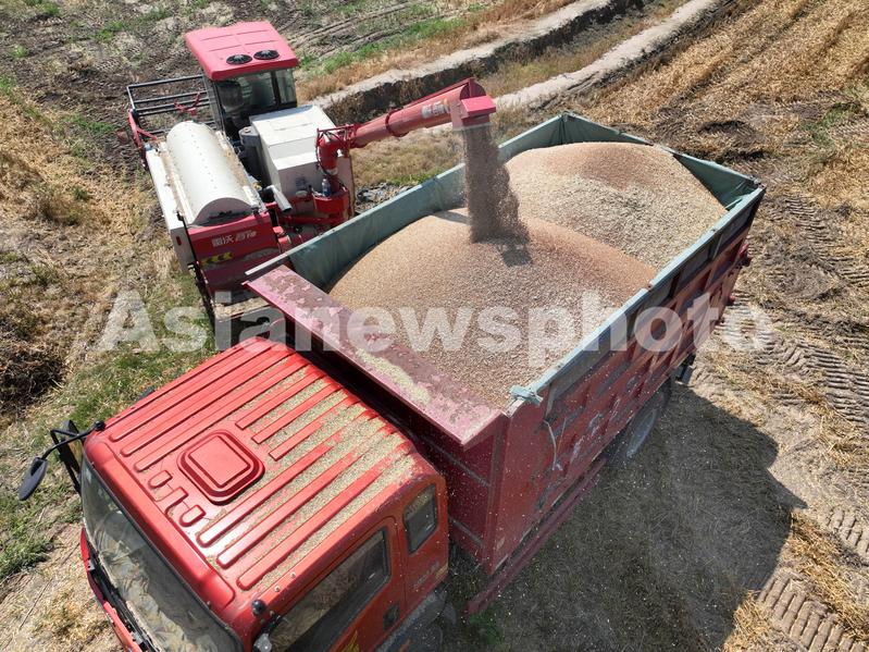 2023年5月28日,收割机在江苏南通江心沙农场二大队的麦田里忙碌卸运刚刚收割的小麦。