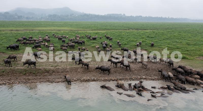 图片说明:2023年5月27日清晨,四川省南充市蓬安县相如街道油房沟社区嘉陵江段,100余头水牛登上太阳岛正啃食青草(无人机照片)。