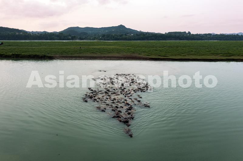 图片说明:2023年5月27日傍晚,四川省南充市蓬安县相如街道油房沟社区嘉陵江段百牛渡江景区,100余头水牛正横渡嘉陵江回游归栏(无人机照片)。