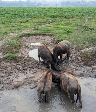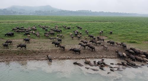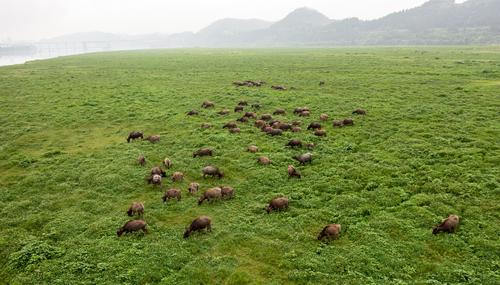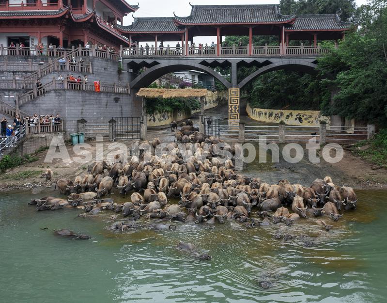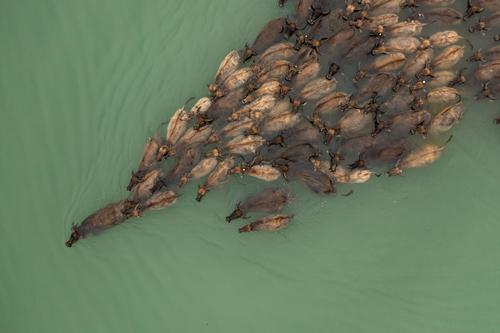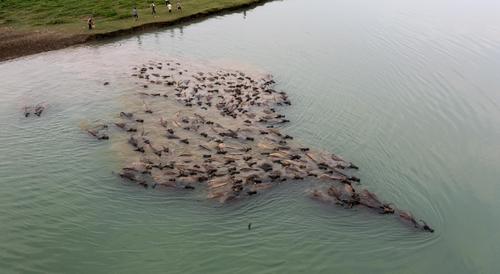 图片说明:2023年5月27日清晨,四川省南充市蓬安县相如街道油房沟社区嘉陵江段百牛渡江景区,100余头水牛正从岸上下水渡江(无人机照片)。