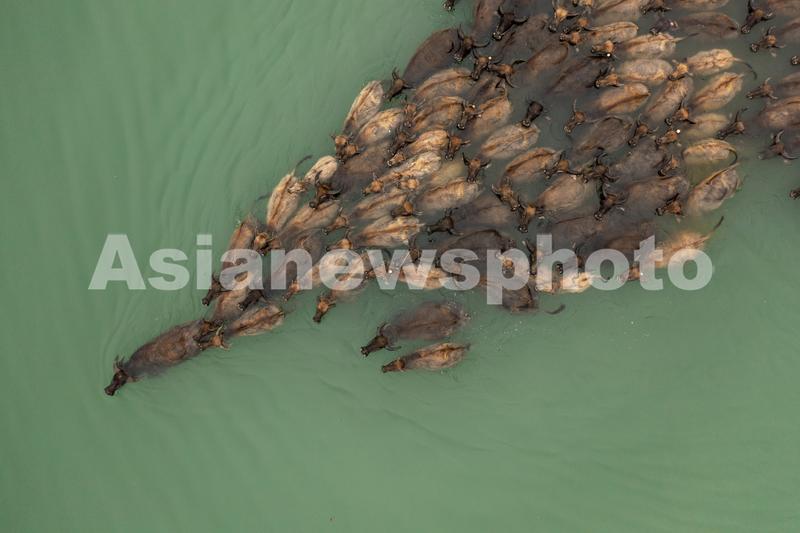 图片说明:2023年5月27日清晨,四川省南充市蓬安县相如街道油房沟社区嘉陵江段百牛渡江景区,牛群在横渡嘉陵江(无人机照片)。