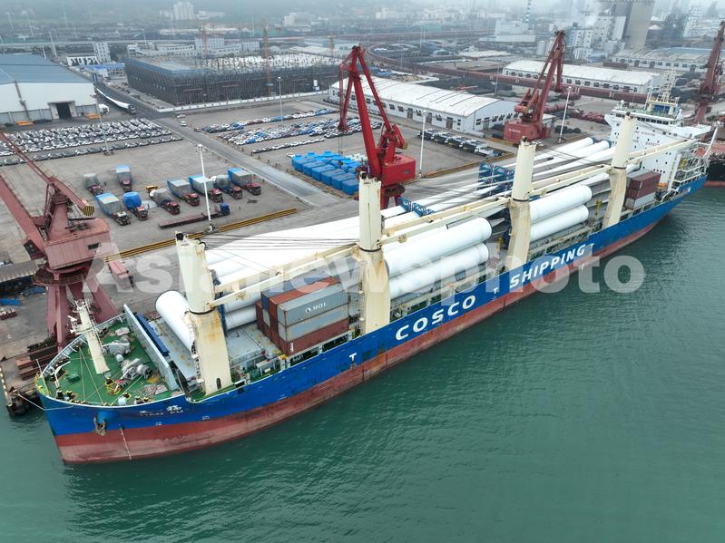近年来,江苏省连云港市大力发展风电设备制造产业,形成了从叶片、塔筒、电机控制系统到机组的风电装备研发和制造产业链,一批又一批风电设备从连云港港装船出口到海外。