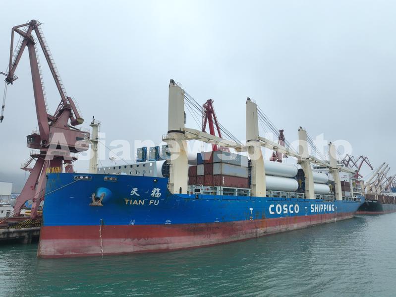2023年5月27日,“天福”远洋轮满载8套风力发电设备在江苏连云港港东方港务分公司码头准备启航运往南非。