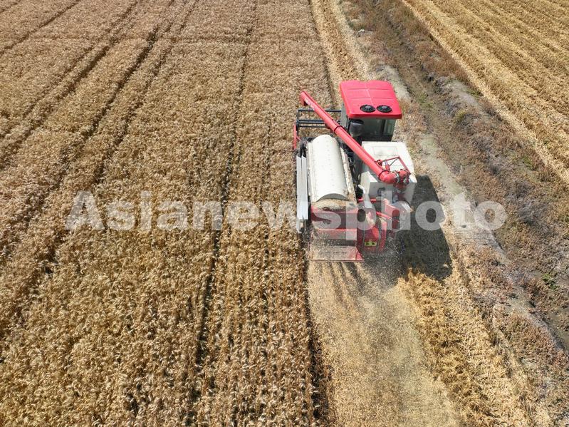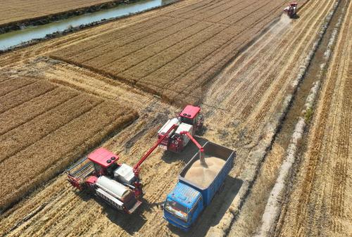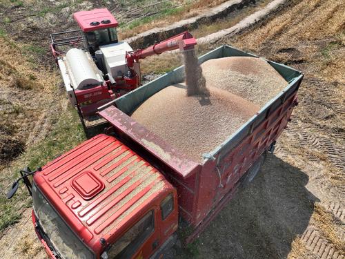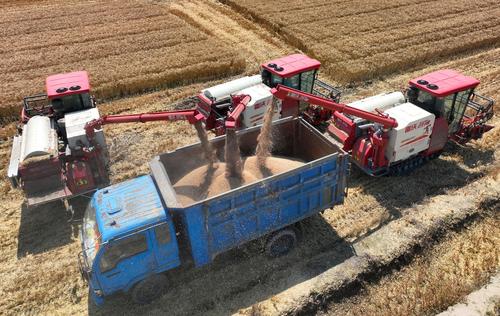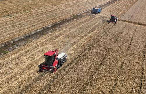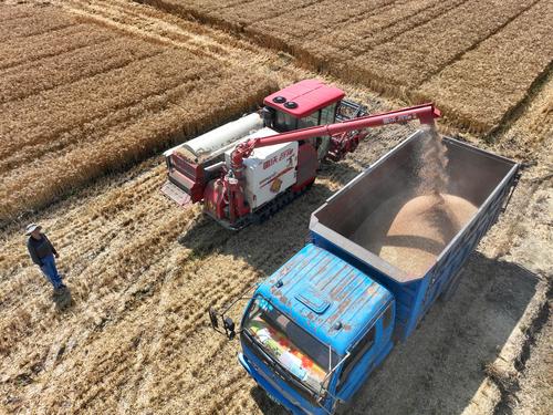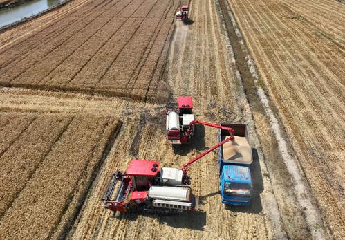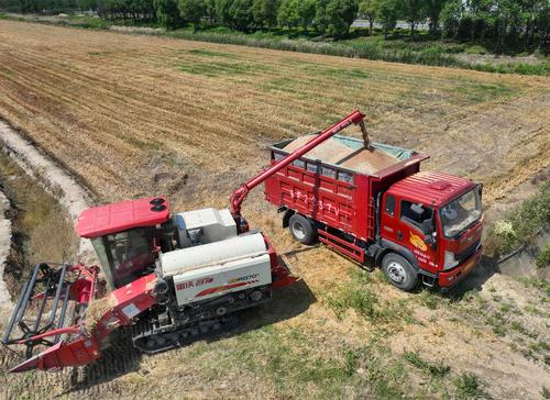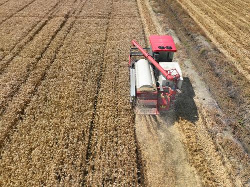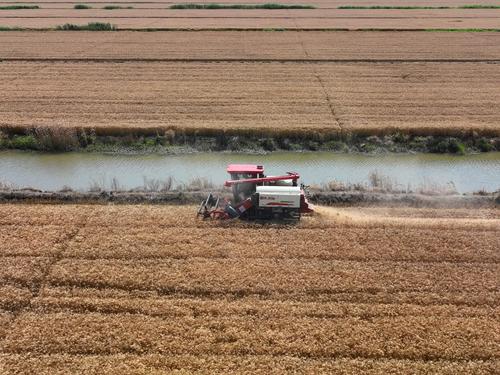 2023年5月28日,收割机在江苏南通江心沙农场二大队的麦田里忙碌收割小麦。今年江心沙农场共种植小麦近7000亩,主要为扬麦23、扬麦24等高抗丰产优质,且广受市场欢迎的强筋品种,今年小麦的产量比预期要好,江心沙迎来了丰收年。“三夏”开展以来,江心沙农场充分发挥“党员先锋岗”带动示范作用,与天气、时间赛跑抢收小麦,采取24小时值守烘干机、劳动竞赛等方式,确保夏粮颗粒归仓。