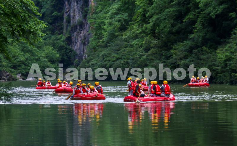 2023年5月27日,在位于四川省巴中市通江县境内的光雾山诺水河世界地质公园内,来自重庆市的游客在体验生态漂流体育项目,感受乡村原生态环境。