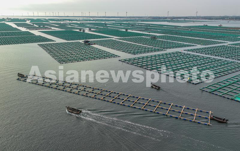 图片说明:2023年5月30日,在山东省荣成市石岛管理区桑沟湾海洋牧场,渔民们驾驶舢板前往生态养殖区开展海上生产作业。